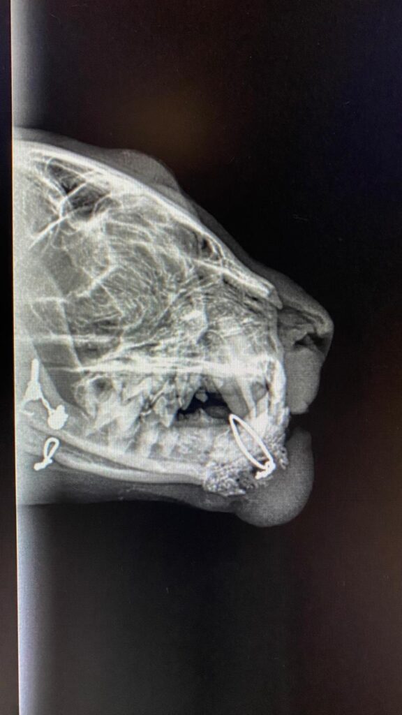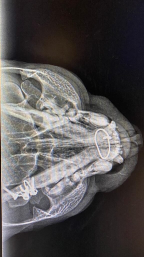 Hubsis Unterkiefer ist wohl nach einem Bruch in der Vergangenheit verdrahtet worden, die Drähte und Schrauben sind deutlich zu erkennen! 😲😪