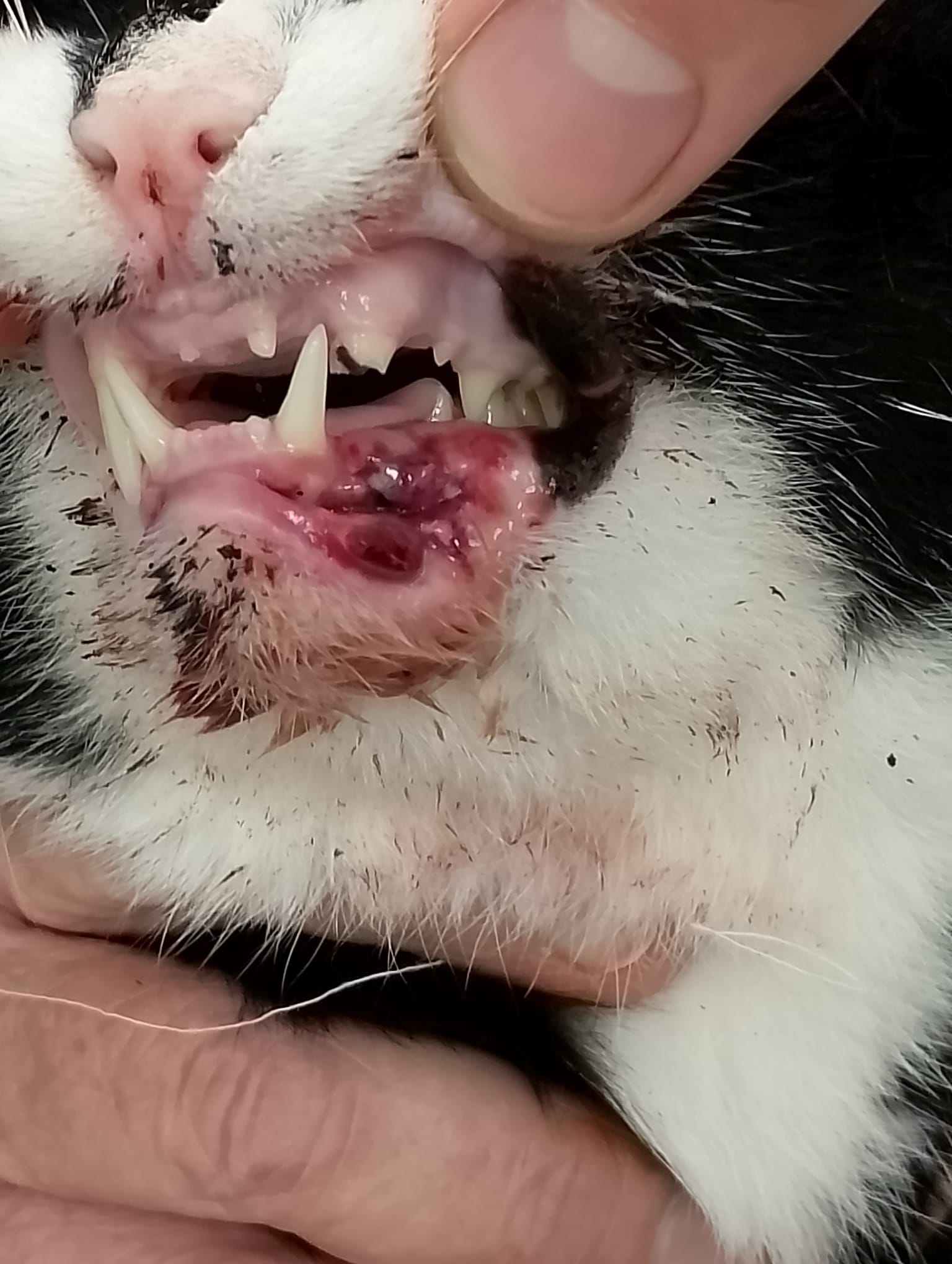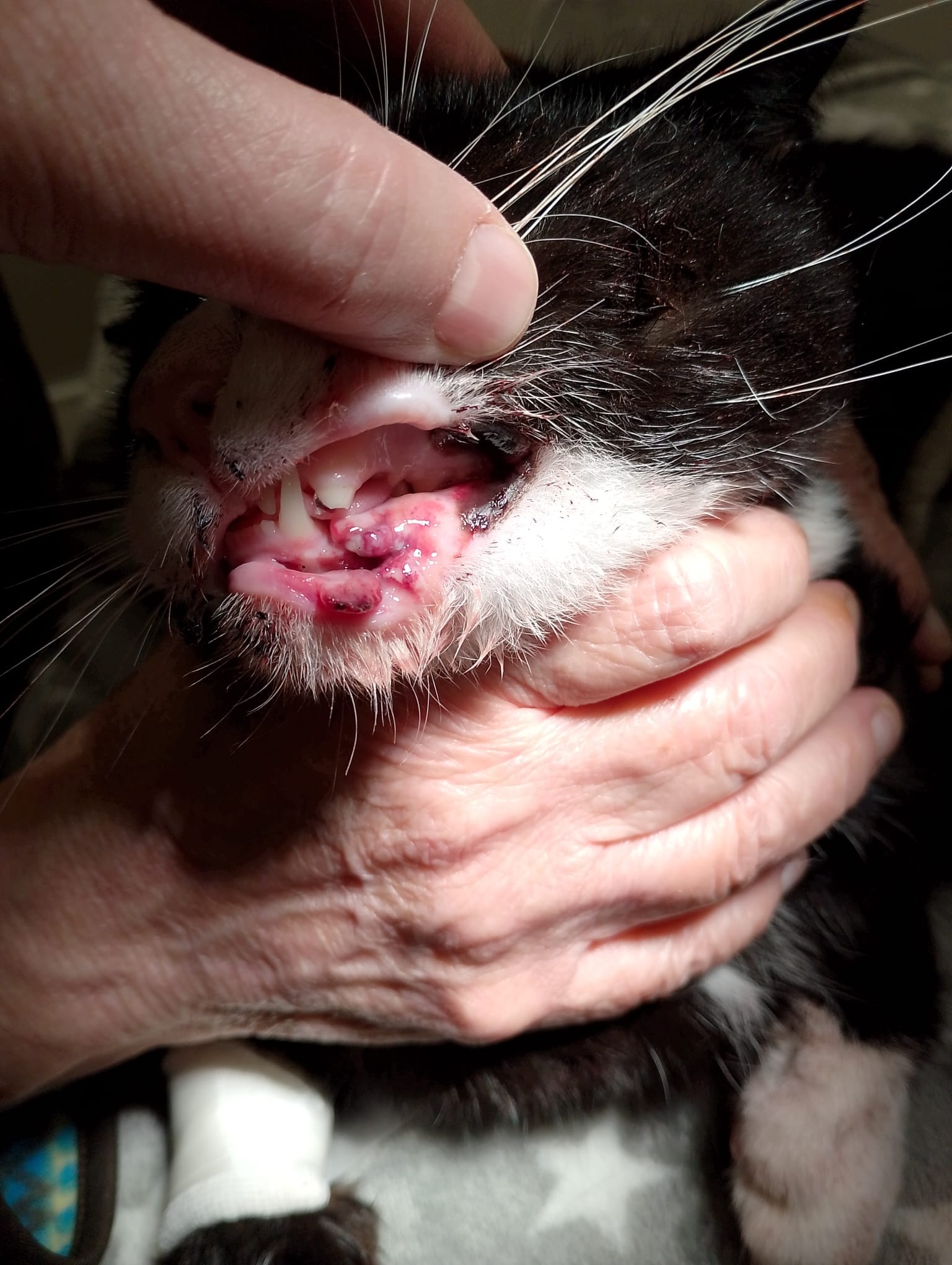 Seine Unterlippe wurde angenäht und ein loser Reißzahn entfernt.