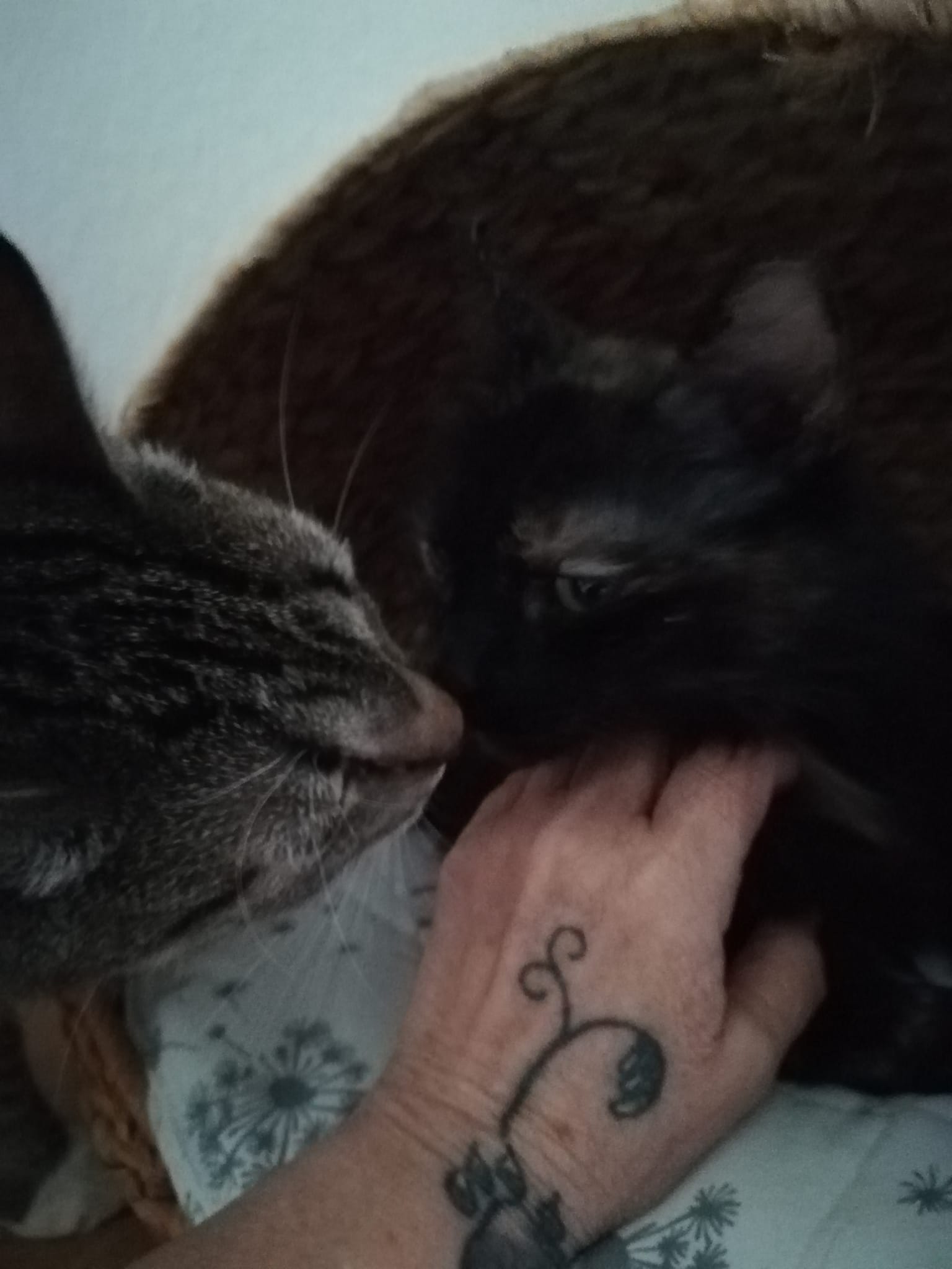 Motte ist nun wieder zufrieden im Kreis iher Freunde – sie genießt die Zuwendung von Miez und Mensch… ![]()